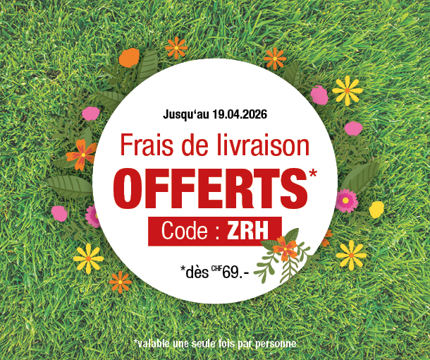 *Valable jusqu'au 19.04.2026 et sur les envois standard. Non valable en cas de retour ou d'annulation de tous les articles commandés. Offre valable uniquement pour les commandes en ligne sur www.vedia.ch. La valeur d'achat minimale (= valeur de ou des articles conservés et payés) est de CHF 69.-. Veuillez saisir le code ZRH lors de la commande.